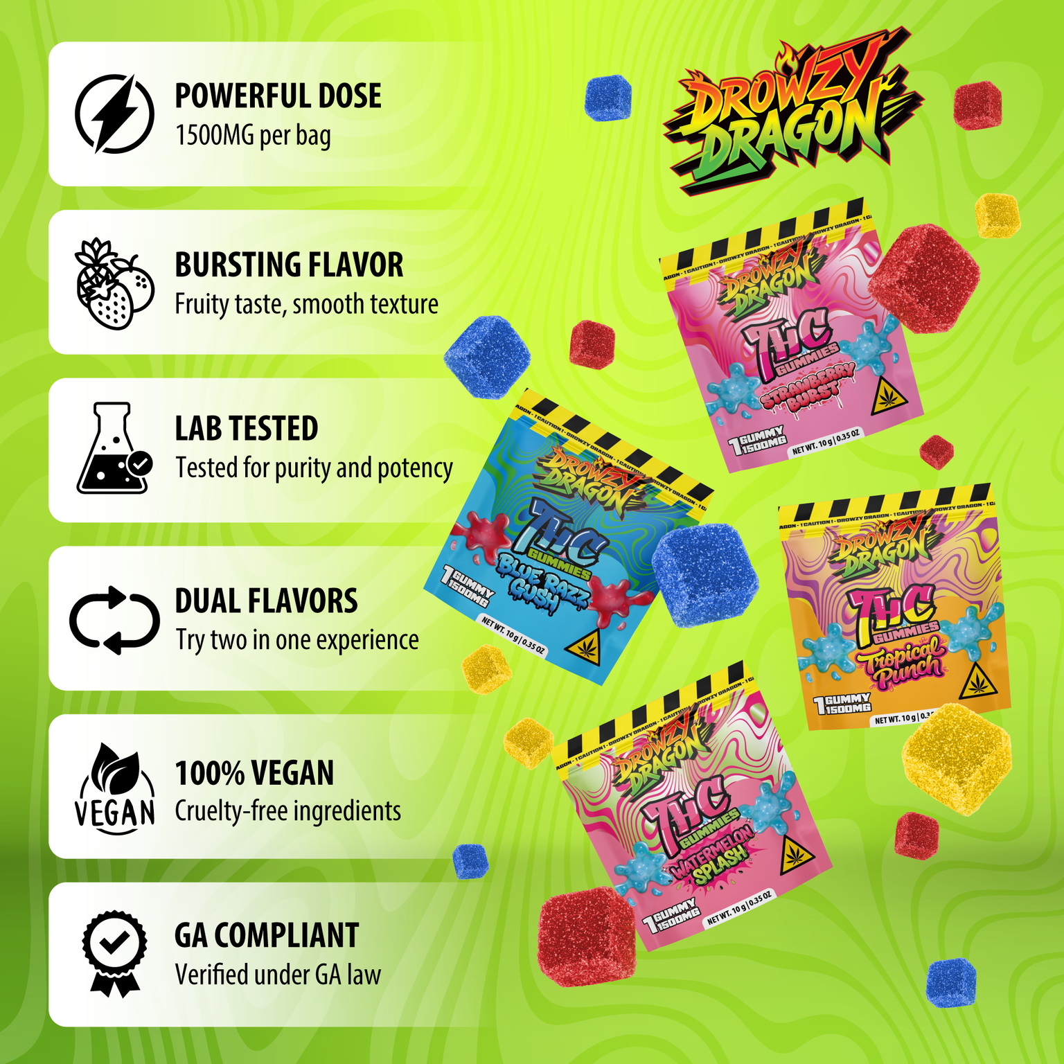Drowzy Dragon THC Infused Gummies I 1500 MG PER PACK I Blue Razz Gush